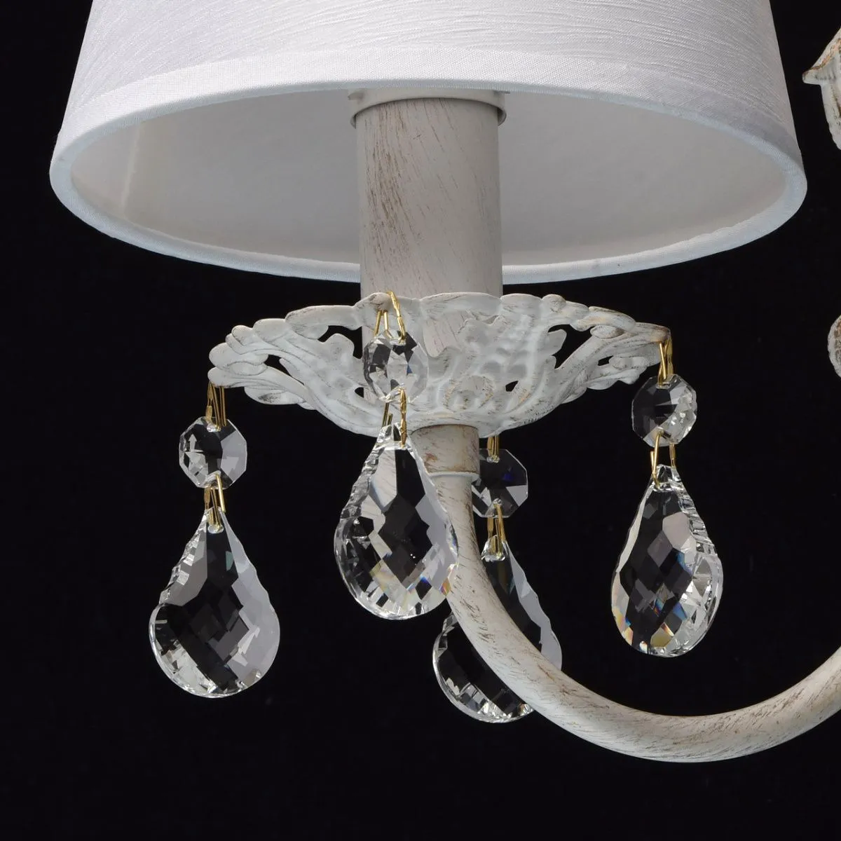 Металлическое основание окрашено в белый цвет с золотистой патиной. Абажур - текстиль белого цвета